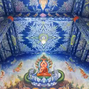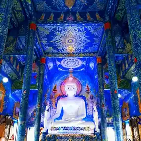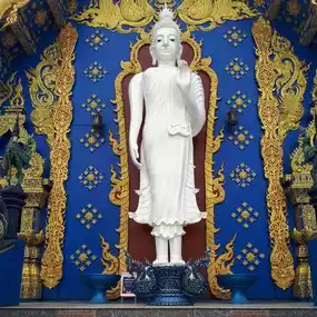 The highlight of this temple is the Rong Suea Ten Temple, which uses a blue-blue tone contrasting with gold to create a striking image of the temple. Inside the temple is the white pearl Buddha statue Phra Phuttha Ratchamongkhon Bodi Trilokanath, 5 meters wide and 6.5 meters high. The walls of the temple are beautifully painted with Buddhist stories.
