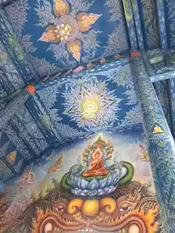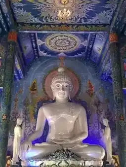 The chapel is exquisitely beautiful. Inside is a large white Buddha image with beautiful murals.