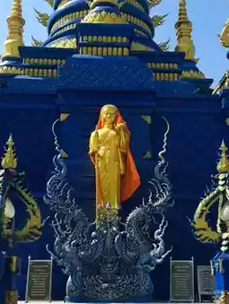 The unique feature is the architecture that emphasizes blue and gold, giving a sense of strength and beauty in another way. The work was created by Salanok, a disciple of Ajarn Chalermchai.