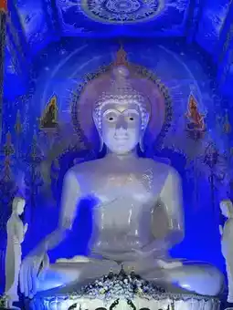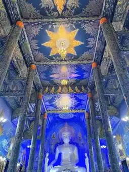 The highlight of this temple is the blue chapel contrasting with the gold. Inside the chapel, there are paintings about the life of the Lord Buddha. There is a large white Buddha statue called "Phra Phuttha Ratchamongkhon Bodi Trilokanath" which is very beautiful. Both inside and outside the chapel are in blue tones. It can be said that each detail here has been perfectly integrated with art.