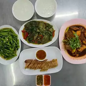 📑 The shop has 8 recommended menus: fried red tilapia with fish sauce, steamed tilapia with plums, red pork and tofu, stir-fried eggplant with drunken noodles, stir-fried wood ear mushrooms with eggs, fried Chinese sausage, stir-fried beef with holy basil, and fried chicken with salt. We tried 3 recommended menus: stir-fried eggplant with drunken noodles, red pork and tofu, and fried Chinese sausage (which was different from what we thought). We also ordered stir-fried morning glory with red chili paste and rice porridge. Every menu we ordered was delicious. Especially stir-fried drunken eggplant and stir-fried morning glory with red chili paste 🥬🫛🌶🥩🍗