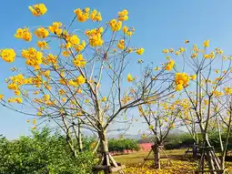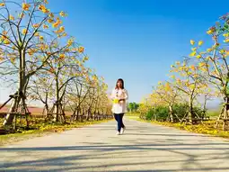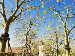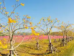 Blooming yellow Cochlospermum flowers at Singha Park, Chiang Rai is one of the famous photo spots in the park. It lined along the pavements creating an aisle of yellow blooms. The cosmos flowers meadows also create a beautiful backdrop for these bright vivid flowers.