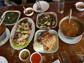 🍜 Local Cuisine: try fresh fishes, soup and veggies by the Mekong river