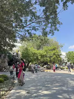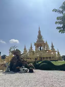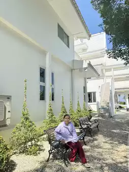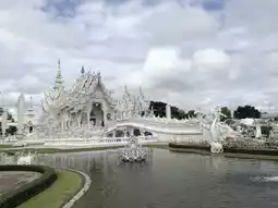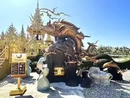 This white temple, clean and bright, showcases stunning art, both inside and out. Visitors can explore the peaceful and cool cave art. Thais are admitted free, but foreigners must pay. Wearing shorts or short skirts is prohibited. There is a shop outside that rents robes for 20 baht each with a 100 baht deposit. The interior of the temple is truly stunning. During lunchtime, various sections are locked for 1.5 hours, preventing the master's art from being displayed. Allow plenty of time to visit. The grounds are spacious, and there's ample free parking.