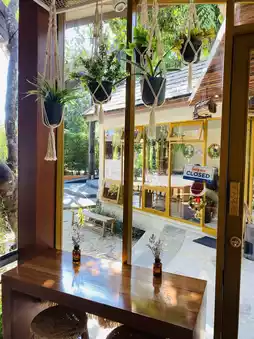 The cafe features charming decor with both indoor and outdoor seating areas. Surrounded by lush greenery, the overall atmosphere is relaxing and ideal for taking a break or snapping some photos.