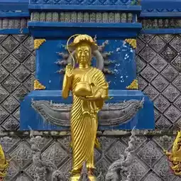 The temple was completed in 2016 and was designed by the students of Ajarn Chalermchai Khositphiphat. It has a unique blue and gold architectural style decorated with Naga serpents.
