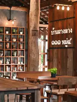 Ban Phang Lang Cafe & Craft is a distinctive cafe located in Mueang Chiang Rai District, near Mae Fah Luang Airport. The cafe stands out with its old timber mill-style design, blending craftwork and wooden furniture that are displayed and available for purchase within the shop.