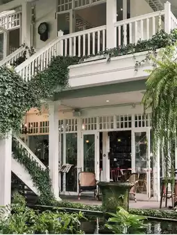 The shop is located in a vintage white wooden house, surrounded by a shady English garden. There are many seating areas to choose from, including an air-conditioned room, a glass room, a garden area, and a riverside terrace, perfect for relaxing or taking beautiful photos.