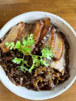 • 🍖 ข้าวเคาหยก (หมูสามชั้นตุ๋นกับผักดอง) – นุ่ม ละลายในปาก