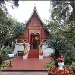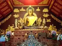 đ.. The temple's ordination hall is in the Chiang Saen style, with a low base and a low sloping roof. Inside is the principal Buddha image, Phra Chao Lan Thong.