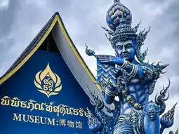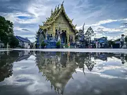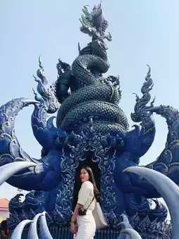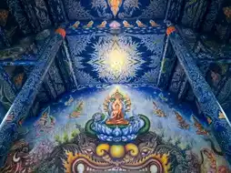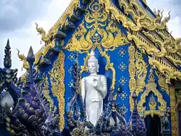 Completed in 2016 by a student of the artist behind the White Temple, the Blue Temple blends traditional Lanna architecture with modern artistic flair. Inside, a luminous white Buddha statue glows under a richly painted celestial ceiling, creating a serene yet surreal atmosphere.