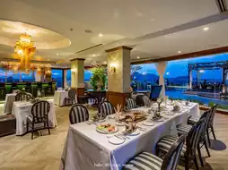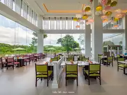 A glass-enclosed restaurant with a view of a relaxing green garden, decorated with a variety of lotus lamps, creating a peaceful and luxurious atmosphere. It also serves a variety of Thai and international dishes, meticulously made with quality ingredients.
