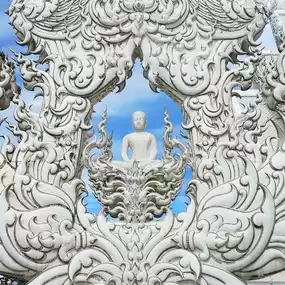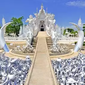 Prepare to be mesmerized by **Wat Rong Khun**, Thailand’s most iconic **contemporary temple**—a blindingly white, mirror-studded masterpiece that blends Buddhist spirituality with **pop culture, sci-fi, and apocalyptic art**. Designed by artist Chalermchai Kositpipat, it’s a temple like no other!