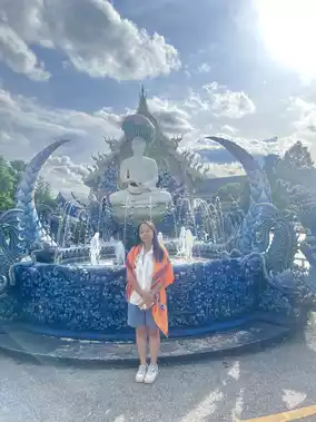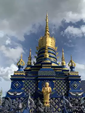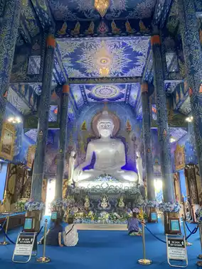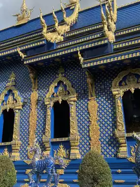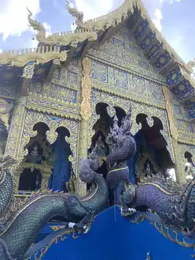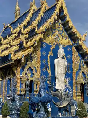 Wat Rong Suea Ten, located in Rong Suea Ten Village, Rim Kok Subdistrict, Mueang District, Chiang Rai Province, is a popular tourist destination known for its unique architectural beauty. This was created by local artist Phutta Kabkaew, or Sala Nok, a local Chiang Rai artist. He was given the opportunity to become a disciple of Ajarn Chalermchai Kositpipat during the construction of Wat Rong Khun, which led to the creation of the Rong Suea Ten Vihara. The temple is incredibly beautiful, boasting a striking, majestic blue color. #GetDiscountsWithoutLuck #BeautifulTemplesChiangRai #WatRongSueaTen