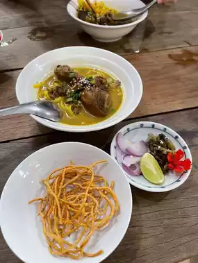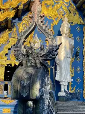 Wat Rong Suea Ten, or the Blue Temple, is located on the banks of the Kok River in Mueang Chiang Rai District, just 3 km from the city. The temple was completed in 2016 by artist Phutta Kabkaew, a contemporary of Ajarn Chalermchai, who created the White Temple. What makes this temple unique is the deep blue and gold tones used both inside and out.