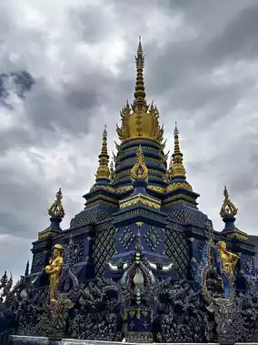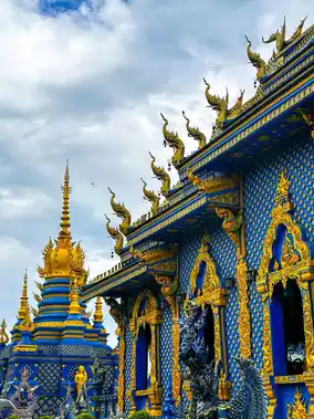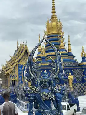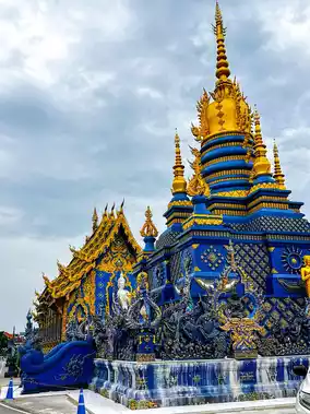 The Rong Suea Ten Temple, aka the *Blue Temple*, is a must-see in Chiang Rai 🌟! Located at 306 Moo 2 Maekok Rd, Tambon Rim Kok, this stunning temple is about 3 km northeast of Chiang Rai city center 🏙️. Built in 2016 by local artist Phuttha Kabkaew, it's a blend of traditional Thai architecture and modern flair 🎨.