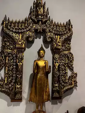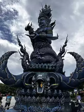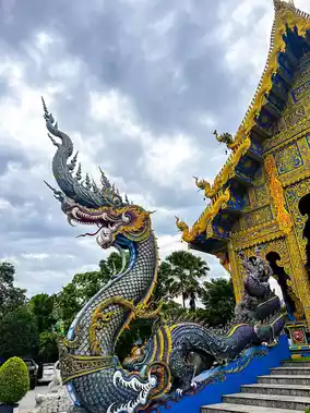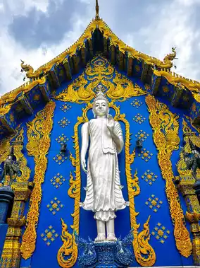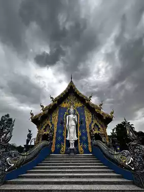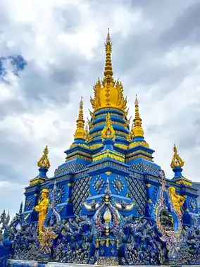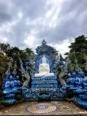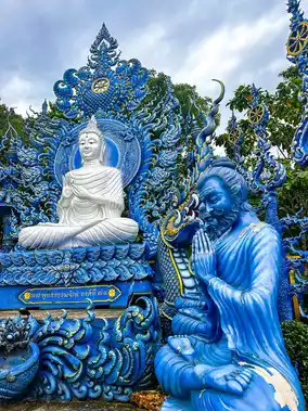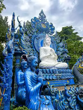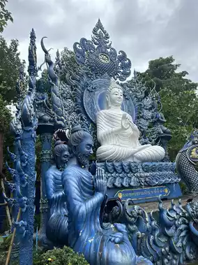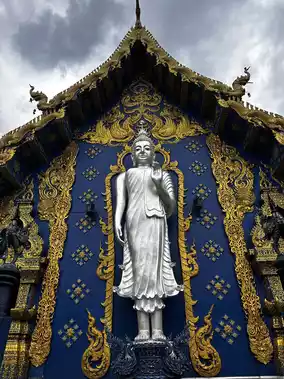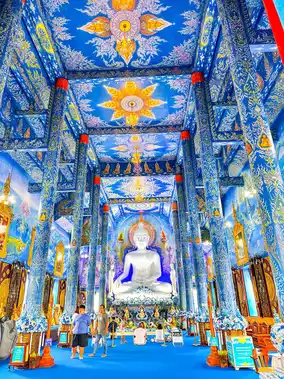 The temple's a visual stunner, boasting a vibrant blue exterior with intricate golden details 💛. Inside, you'll find a serene white Buddha statue, celestial murals, and decorative columns 🎨. The design incorporates Lanna style with modern surrealist touches, making it one of Thailand's most photogenic temples 📸.