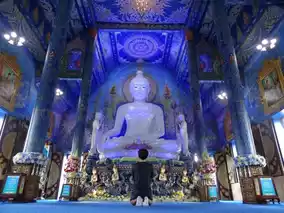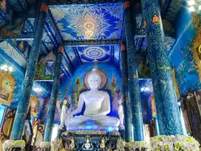 ✅The principal Buddha image, "Phra Phuttha Ratchamongkhon Bodhi Triloknath," is beautifully contrasted with the blue walls.