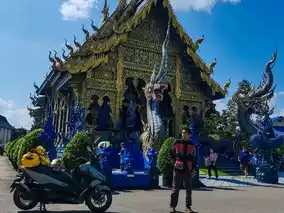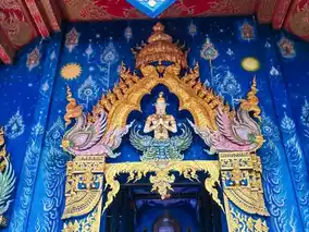 Wat Rong Suea Ten is a famous temple in Mueang Chiang Rai District. It stands out with its vibrant blue chapel, contrasted with gold motifs. Built by Sala Nok (Phutthakorn Sikhalip), a disciple of Ajarn Chalermchai Kositpipat, the temple's contemporary art style resembles Wat Rong Khun, yet it has its own unique identity.