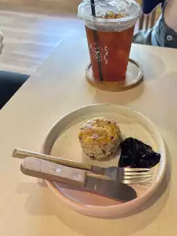 Homemade, low-sugar scones with a slightly dense, yet perfectly crumbly texture. Served warm with homemade clotted cream and reduced-sugar blueberry jam. A delicate English-style aroma, available in a variety of flavors, including plain, blueberry, and Earl Grey.