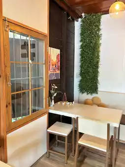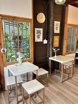📸 Plenty of photo opportunities, both inside the cafe, decorated with wooden furniture and beautiful natural lighting, and outside with lush greenery, creating a homey, minimalist feel.