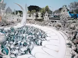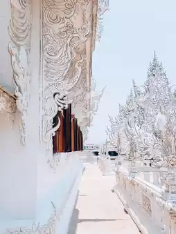 When thinking of Thailand, the land of Golden Temples, you might immediately picture its famous golden temples. However, Wat Rong Khun, an extraordinary all-white temple, offers a surprising and exciting experience. Ranked among the most beautiful temples in the world, it has also become a national cultural symbol of Thailand. Located in the northern Chiang Rai province, Wat Rong Khun was constructed in 1997, inspired by the vision of Chalermchai Kositpipat, a renowned Thai painter and architect. As an artist and devout Buddhist, Chalermchai envisioned a temple entirely in white to represent Buddha's purity. The temple remains incomplete, as Chalermchai plans to create a complex of nine main structures. He estimates that completing the project would take 60-90 years of dedicated effort, but given his age of over 60, he has enlisted the help of his five best students to ensure the temple's completion after his passing. Known as Wat Rong Khun, it is also referred to as Thailand's White Temple due to its entirely white design. Combining traditional Thai temple architecture with surreal elements, the temple's unique design is truly awe-inspiring. Inside, visitors are greeted by a dazzling pure white interior, reminiscent of snow-covered surroundings. The temple grounds feature a park, an aquarium, and stunning white sculptures. The intricate carvings and sculptures are so detailed that exploring them from one structure to another never gets dull. The temple is easily accessible, just a 30-minute bus ride from Chiang Rai's provincial center. Visitors should dress modestly when entering the temple. A notable feature of the site is a striking yellow building within the temple grounds. While many might mistake it for a special structure or temple, it is actually a two-story restroom, adorned with elaborate and splendid carvings.