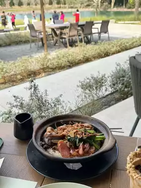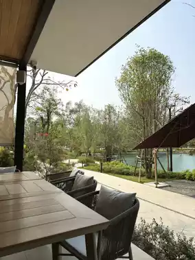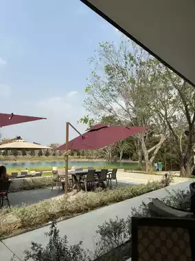 This lovely cafe offers both food and beverages. The menu offers a wide selection. The white interior is set by a blue lake, surrounded by lush greenery. It's relaxing and offers a relaxing atmosphere.