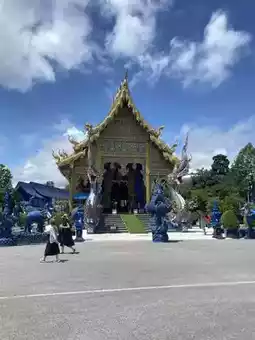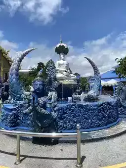 Another must-visit temple in Chiang Rai is Wat Rong Suea Ten. This temple stands out with its vibrant blue chapel adorned with intricate contemporary Thai art, blending elegance and grandeur into a unique masterpiece. Inside, you'll find a large white Buddha statue contrasting beautifully with the blue tones of the hall, creating a serene and soothing atmosphere. The surrounding area is filled with a sense of faith and vitality, making it perfect for both photography enthusiasts and those seeking to pay respects and make merit. Truly, this is a landmark you shouldn't miss when visiting Chiang Rai.