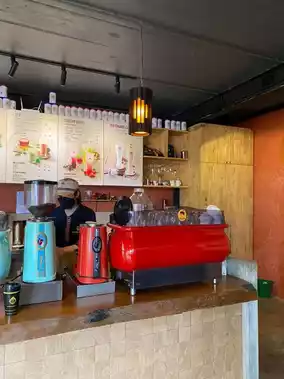 The shop has a small garden setting with a cozy corner for sipping coffee. The shop is lined with shady trees.