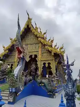 Wat Rong Suea Ten in Chiang Rai is absolutely breathtaking! It's famously known as the "Blue Temple." 💙 From the moment you arrive, you're greeted by magnificent blue Naga (serpent) statues at the entrance, leading to the main chapel adorned with deep sapphire blue and dazzling gold accents. The craftsmanship is truly spectacular! 🤩