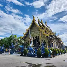 • 💙 The dark blue Ubosot (ordination hall) contrasts with gold patterns.