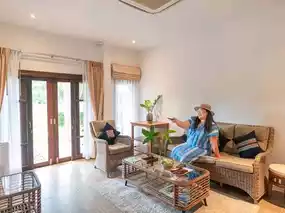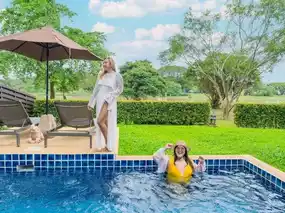🏡 This time, Moo and her friends stayed in a Two Bedroom Pool Villa, featuring two bedrooms, two bathrooms, a central living room, a balcony, and a private pool right on the river. The villa offers over 185 square meters of living space. Enjoy in-room dining or enjoy the Afternoon Tea set on the balcony, enjoying the cool breeze and the natural surroundings.