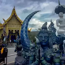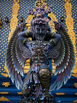 @Wat Rong Suea Ten, or Blue Temple, in Chiang Rai, Northern Thailand. Figure in the fabulous Wat Rong Suea Ten, or Blue Temple, in Chiang Rai, Northern Thailand. This modern Buddhist temple is packed with ornate figures and carvings mostly in a blue colour scheme for a spectacular and very different looking experience to traditional golden finishes. It's also designed by a student of the architect who designed the famous White Temple in the same city. Both are well worth visiting.