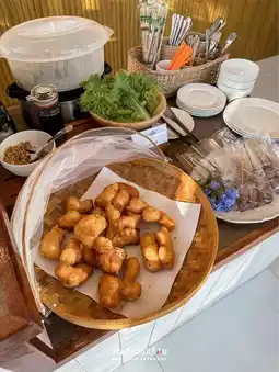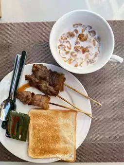 There is also breakfast, but there is not a lot of food. There is toast, sticky rice with grilled pork, and fried dough sticks.