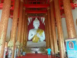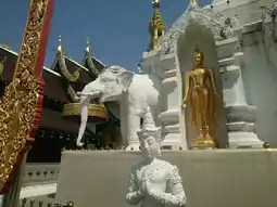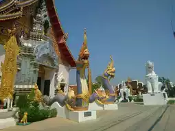 .. Inside the temple, there is a beautiful white idol of the Omniscient Buddha. In front of the chapel, there are Naga and a fearsome lion.
