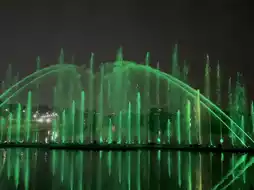 Colorful lights shimmer on the water's surface, dancing to the rhythm of the musical fountain,
