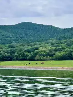 We arrived at Songhua Lake just as the light started to soften, casting gold across the water. The lake stretched wide and calm, framed by soft green hills that seemed to roll on forever. We rented a small boat and drifted out, the gentle hum of the motor the only sound cutting through the stillness. There was something timeless about it like everything slowed down, and we were allowed to just exist for a while 🌅🛶🌿