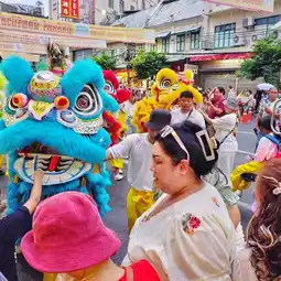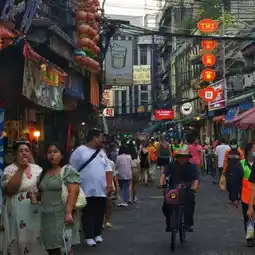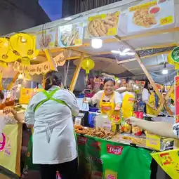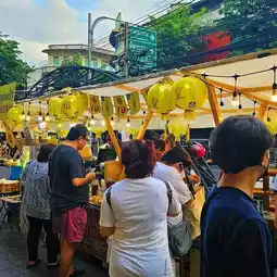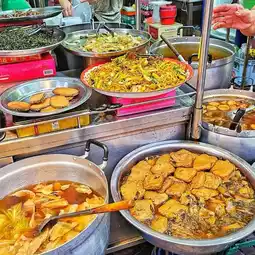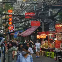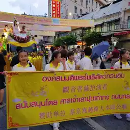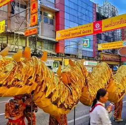 Min recommends coming in the evening to park your car at various parking lots, as Yaowarat has many parking lots, whether in buildings or temple parking lots. The service fee for each place is different. When you're done, you can walk on the main road or in the alleys, where you'll see a lot of vegetarian food, both rice and sweet, for a full 12 days every year on Yaowarat Road.