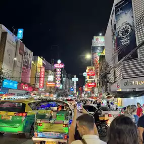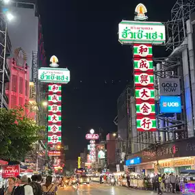 Yaowarat at night is one of the liveliest and most vibrant places in Bangkok. It is a district full of colors and a variety of food smells, making it a paradise for food lovers. When the sun sets, Yaowarat transforms into a street of twinkling lights, with restaurants and street stalls starting to light up and serve their customers.