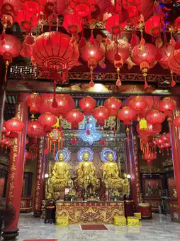 1. Wat Mangkon Kamalawat (Wat Leng Noei Yi) – Start the day with good fortune. Since you’re in Yaowarat, let’s start the trip by worshiping Buddha and asking for blessings first! Wat Mangkon Kamalawat, or as it’s popularly known as “Wat Leng Noei Yi,” is an ancient Chinese temple with magnificent architecture. The highlight of this temple is worshiping Tai Sui, the god of destiny, and Guan Yin, the Bodhisattva. For those who want to increase their fortune, good health, or ask for a blessing for a prosperous business,