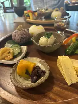 • The signature lunch options are the "Satoyama Seasonal Rice Ball Plate" and "Stone Oven Bread Plate" (each around 1,300 yen). Featuring homemade and locally sourced vegetables, miso rice balls, chestnut rice, grilled root vegetables, stone oven bread, quiche, and more, the dishes are rich in flavor.