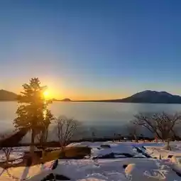 Lake Shikotsu is said to be the northernmost non-freezing lake in Japan. The view from the lake-side room is as shown in the picture, and the lake and sunrise were beautiful.