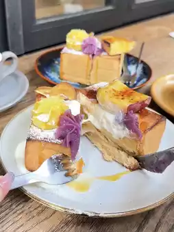 I ordered the "baked sweet potato brûlée toast. The toast is thick and topped with a brûléed baked sweet potato, sweet potato paste, and ice cream.😋