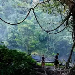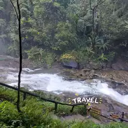 The waterfall is beautiful. The water flows strongly and hits the ground below, creating mist all over the waterfall. If you walk near it for a long time, you will get wet.