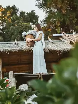 and a villager's colorful flower garden.