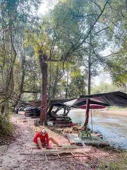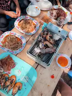 💪🏻 We brought all our own luggage. It can be called a mobile picnic box. But for those who don't have anything, don't worry. They have pavilions for rent and many restaurants selling things such as grilled chicken, papaya salad, made-to-order food, and drinks 😍 The shop is only open during the summer. If you come during other seasons, you may have to bring your own stuff. 😉