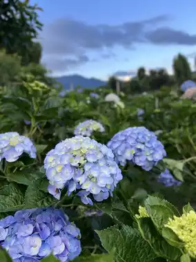 The beauty of the hydrangea fields contrasts with the intricate mountain views, rice fields, and the sun and soft sunlight that is about to set behind the mountains. It is a beautiful and impressive sight.