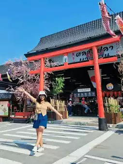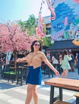 🌼The atmosphere is definitely great for photography lovers because from the entrance, there are cool photo spots that make you feel like you are in Japan. There is a prominent torii gate at the entrance, as well as cherry trees, carp flags, and big mackerels. There are also many restaurants decorated in a peaceful Japanese style, so you don't have to worry about going hungry.