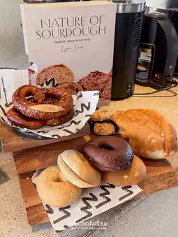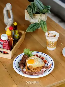 Check out the menu, it looks very tempting. To be honest, the prices are a bit high, but it's worth it. We ordered American fried rice for 215 baht. The presentation and taste were excellent. The rice was fluffy, and the grilled chicken was crispy. The ham, sausage, and fried egg were also included. Two people could eat it and still feel full 😂. Other menu items include single plate rice, stir-fried soy sauce noodles, and sourdough bagels.