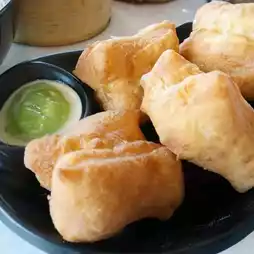 The shop is beautiful, has a good atmosphere, decorated in Chinese style, and of course, there are many breakfast options to choose from. Let's start with the top dishes, such as fried dough sticks, pandan custard, so soft and delicious. Bak kut teh, no need to go far, you can come and eat here, you can have a full meal, fried lava buns, Hong Kong fried noodles, bouncy pork congee + soft-boiled eggs, a very special breakfast because the shop makes everything itself.